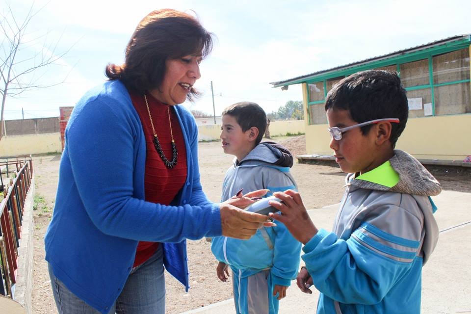 Ana María Soriano de Castrejón, presidente honorífica del SMDIF, acompañada por el director, Felipe de Jesús Gómez, entregó parte d estos apoyos en las escuela primarias Joaquín Amaro y Niños Héroes, de las comunidades Corrales y La Batea.