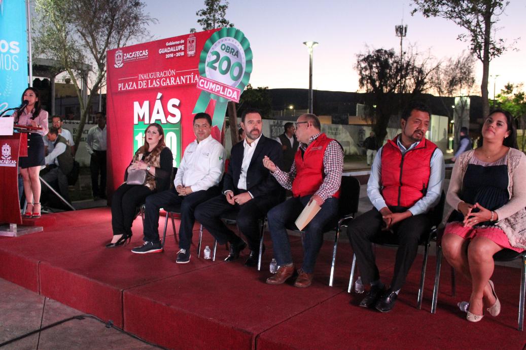 En la inauguración de la Plaza de las Garantías también estuvieron presentes Arnoldo Rodríguez Reyes, delegado de la Secretaría de Desarrollo Agrario, Territorial y Urbano (Sedatu); los diputados locales Isadora Santiváñez Ríos y Osvaldo Ávila Tizcareño; Lucía Medina Mazzoco, presidente honorífica del Sistema Municipal para el Desarrollo Integral de la Familia, así como funcionarios de Guadalupe.