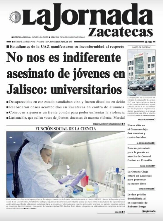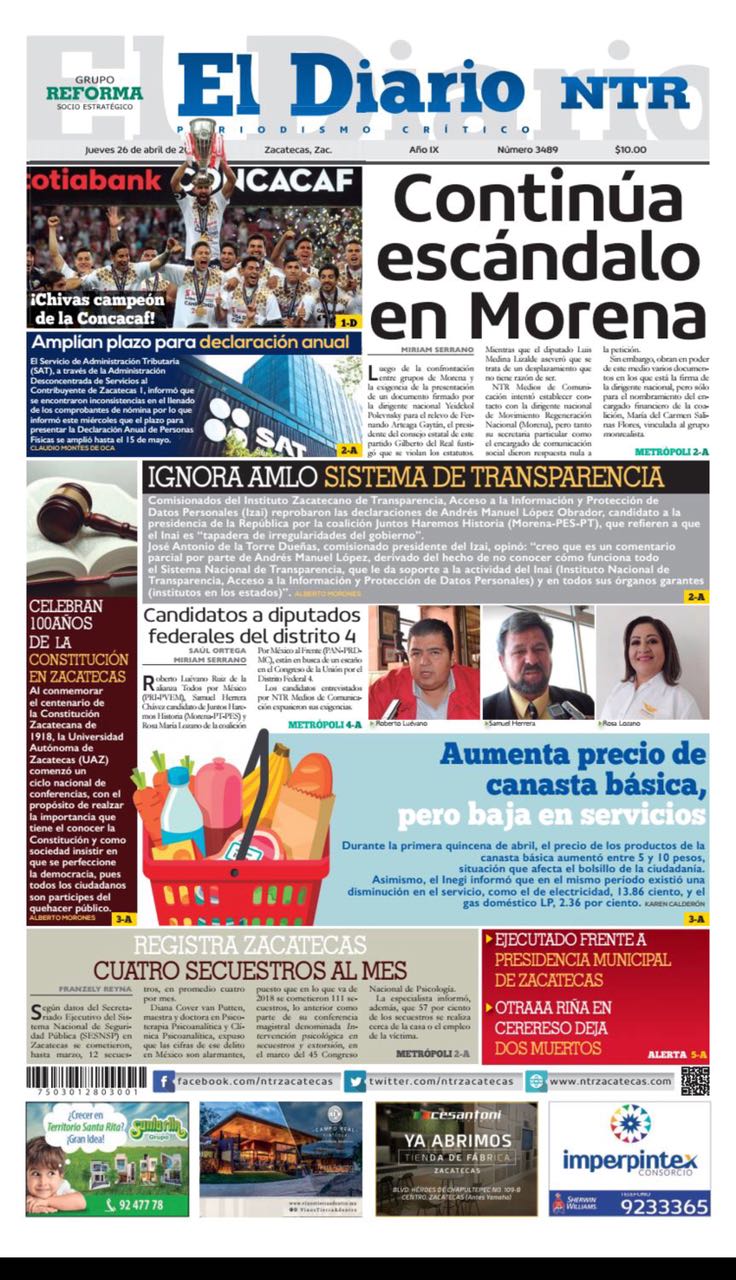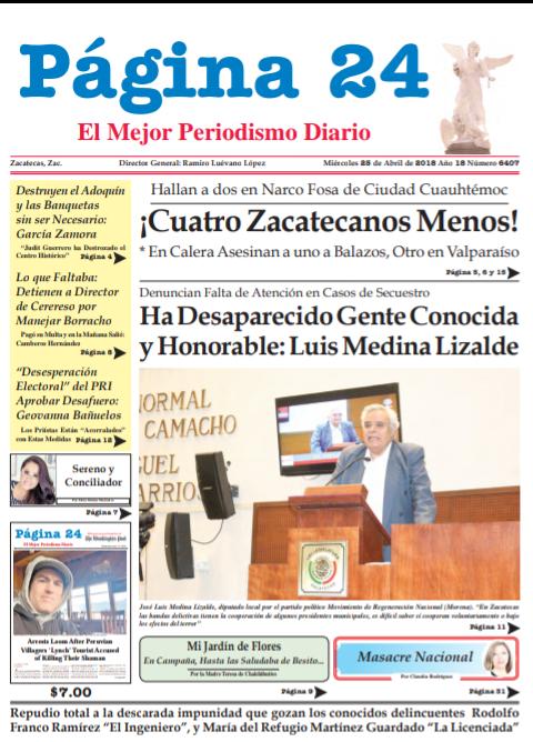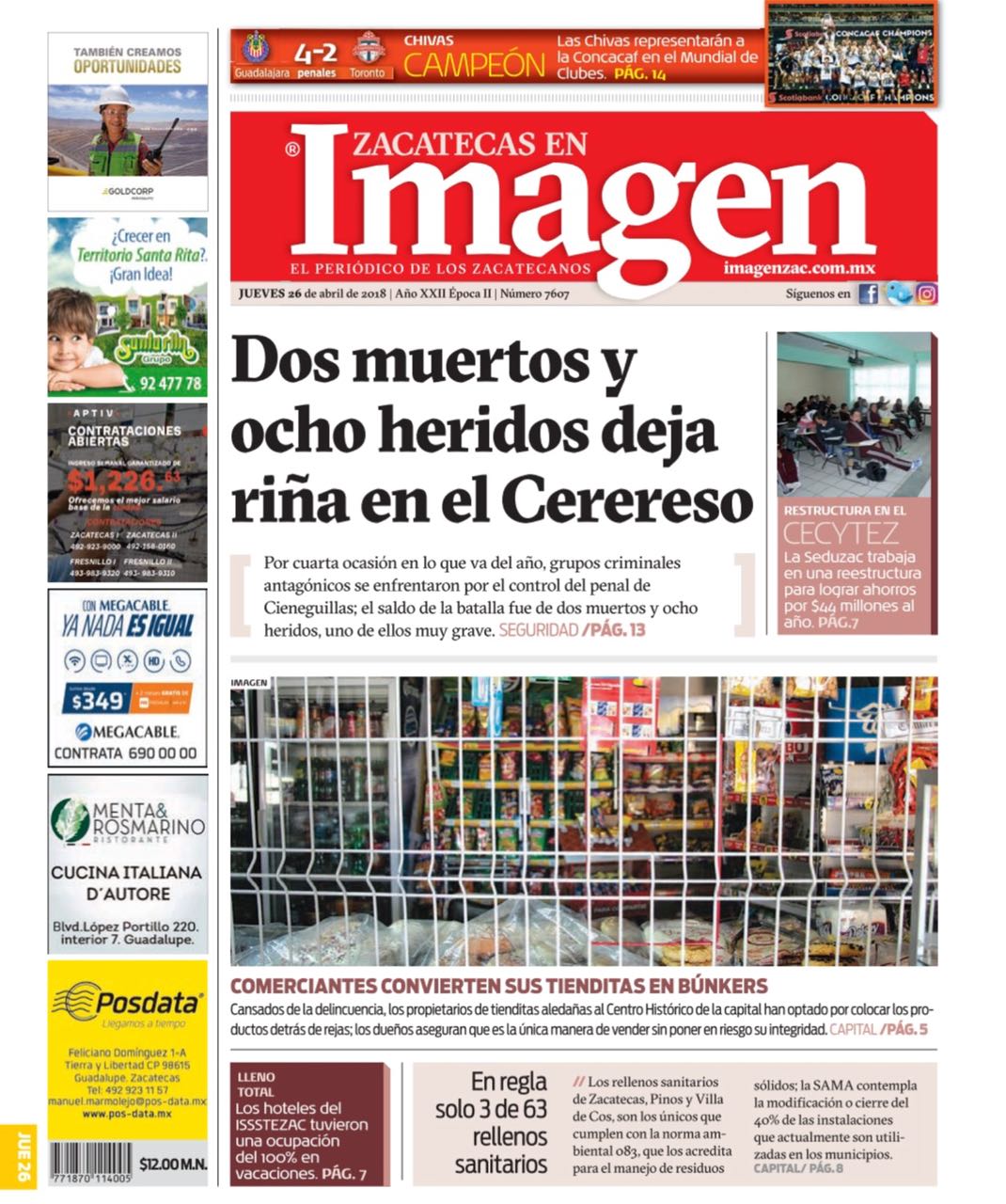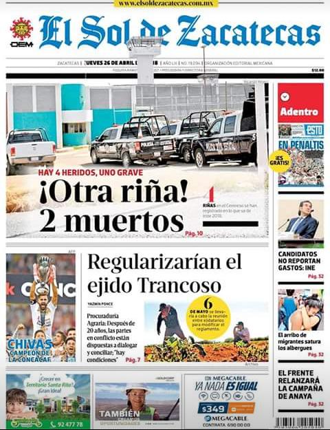 Locales Portadas de diarios impresos Zacatecas jueves 26 de abril Admin 26 abril, 2018 147 Views Puedes compartir esta noticia en tus redes sociales.