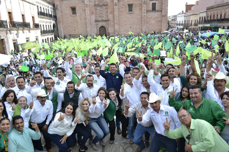 Simpatizantes y militantes de Río Grande, Loreto, Sombrerete, Juan Aldama, Cuauhtémoc, Valparaíso, de la capital y Jerez, entre otros municipios, se dieron cita en la Plaza de Armas para mostrar su respaldo a los abanderados en la presente contienda electoral.