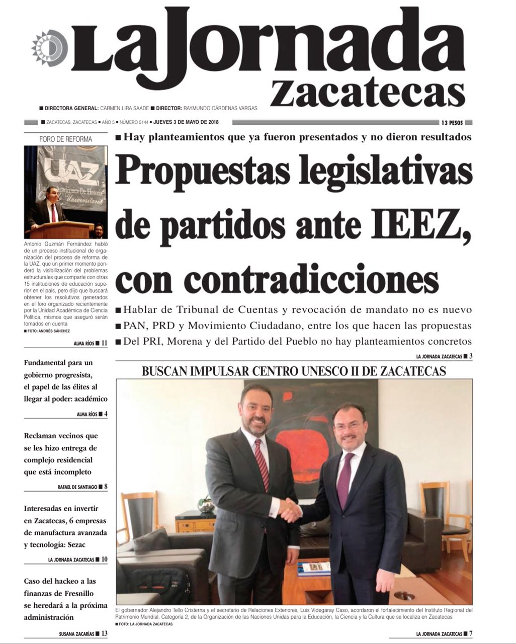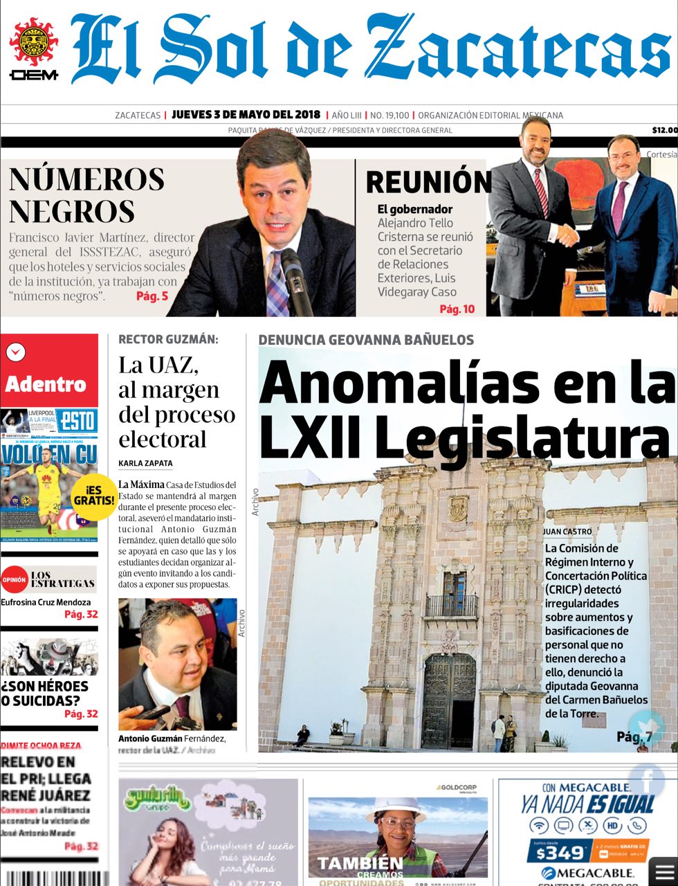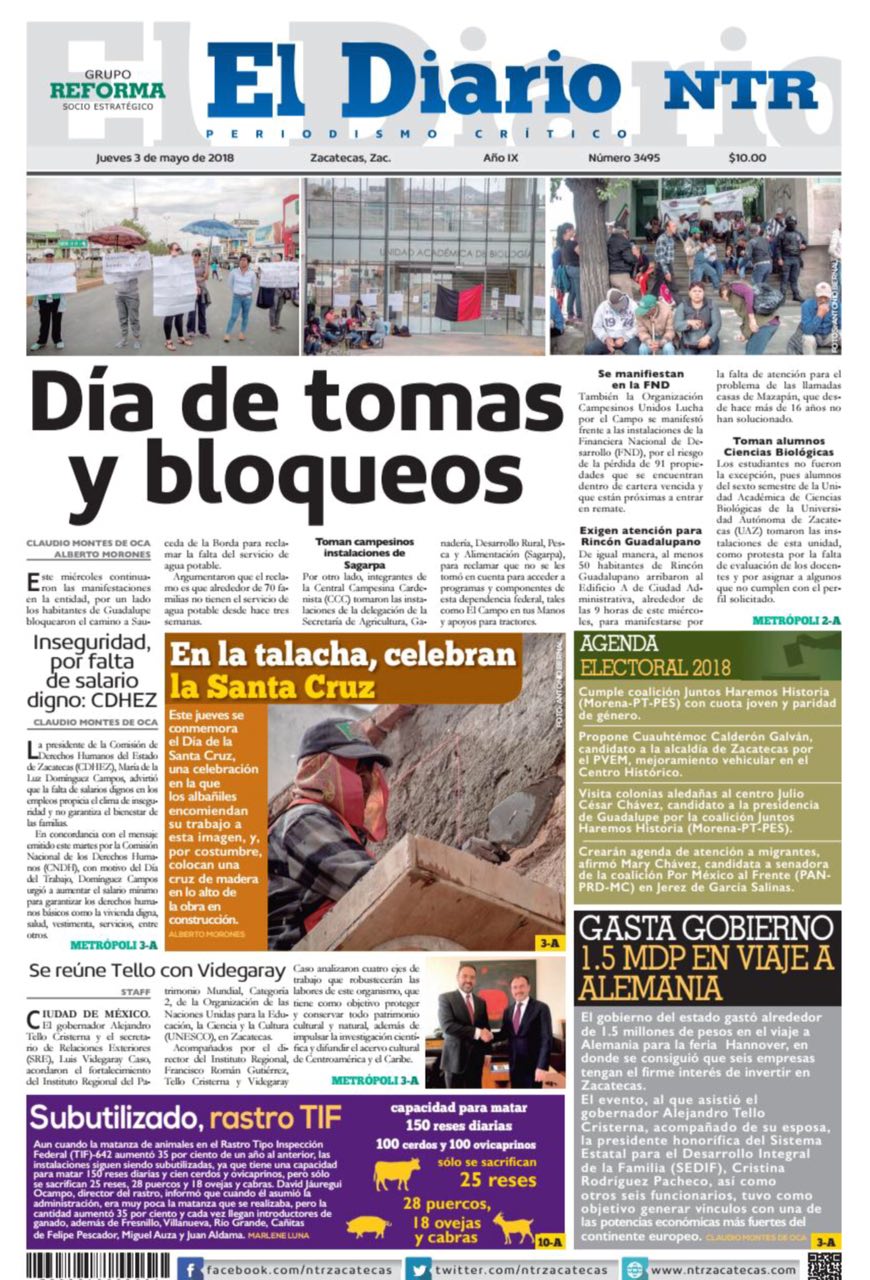 Locales Portadas de diarios impresos Zacatecas 3 de mayo Admin 3 mayo, 2018 418 Views Puedes compartir esta noticia en tus redes sociales.