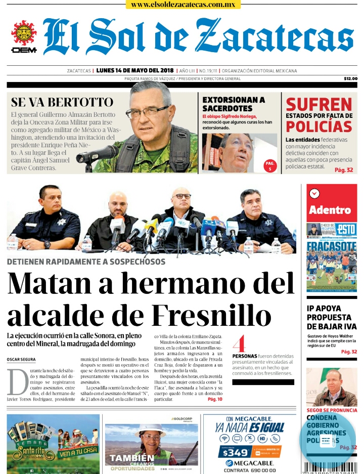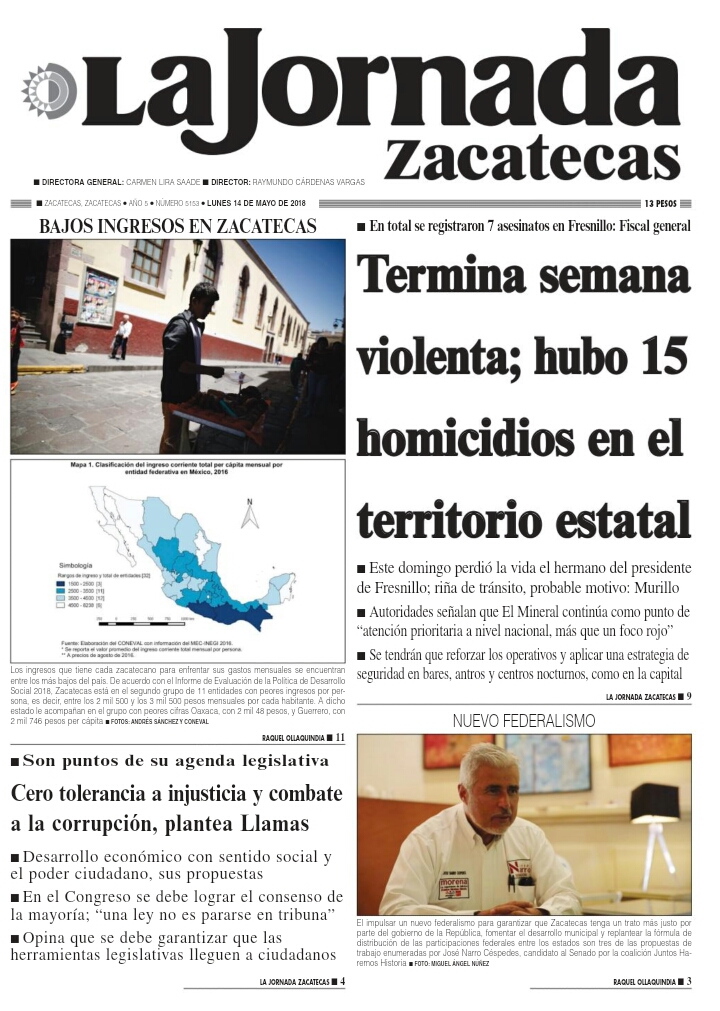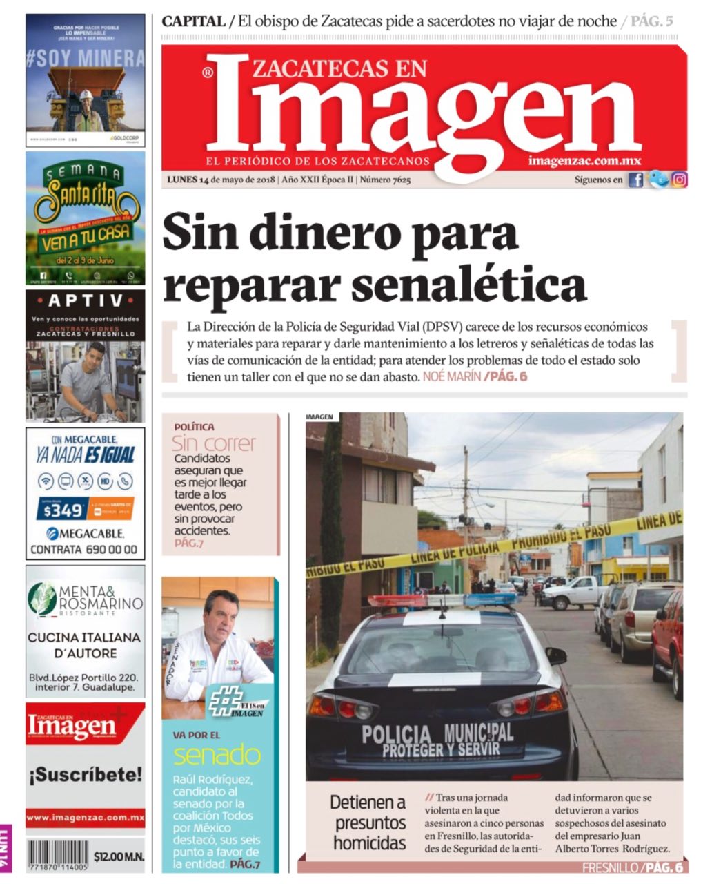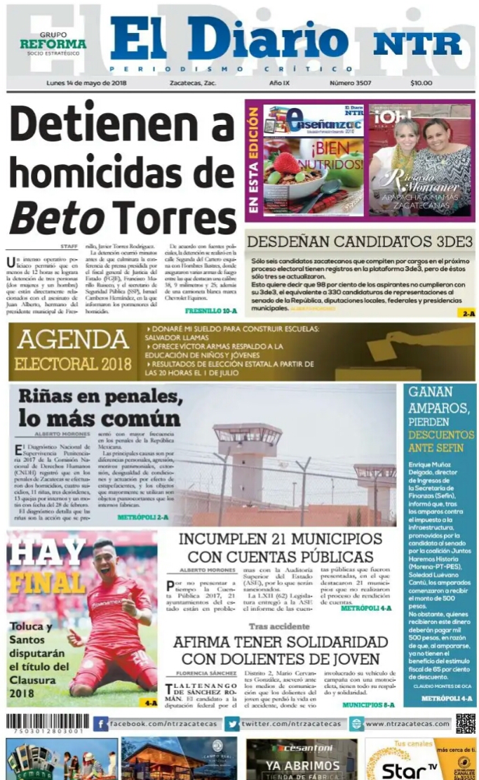 Locales Portadas de diarios impresos Zacatecas lunes 14 de mayo Admin 14 mayo, 2018 73 Views Puedes compartir esta noticia en tus redes sociales.