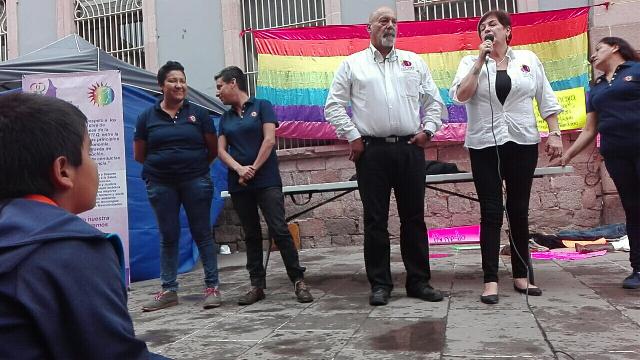 En la conmemoración del Día Internacional contra la Homofobia, Lesbofobia, Bifobia y Transfobia, activistas y grupos promotores de la diversidad sexual realizaron una serie de actividades artístico-culturales en el Centro Histórico de Zacatecas. Aquí, los dirigentes de Familiares Contigo (FaCon), Alejandro Gutiérrez y Dulce María Flores, quienes tuvieron que aceptar que su hijo era gay y le brindaron su respaldo.