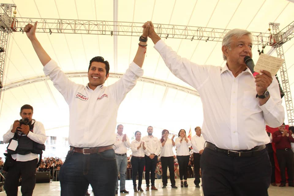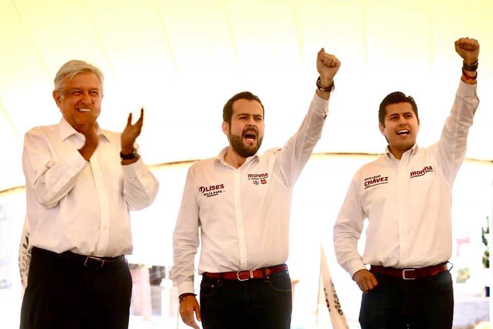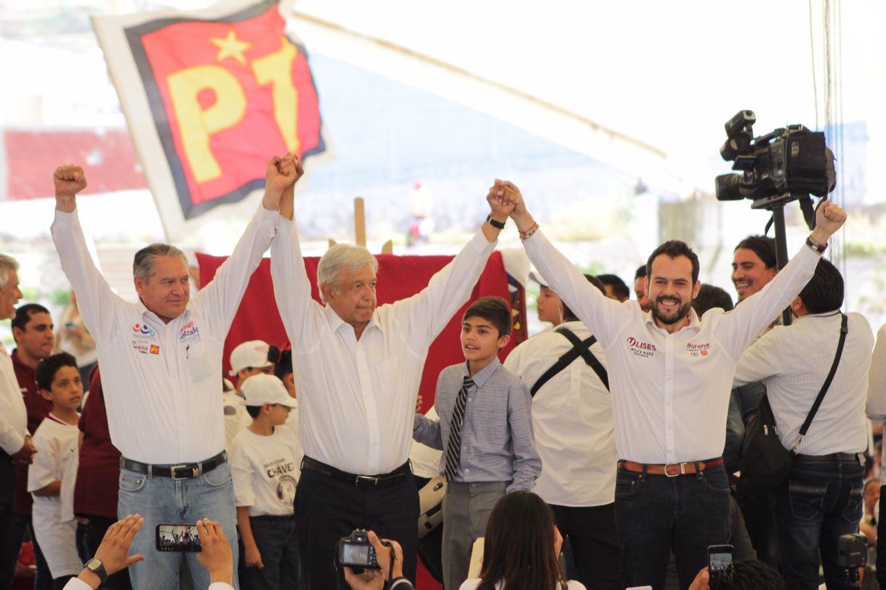 Acompañado por Fernando Arteaga Gaytán, dirigente estatal de Movimiento Regeneración Nacional (Morena), Alberto Anaya Gutiérrez (líder nacional del PT), Hugo Eric Flores (del Partido Encuentro Social) y Tatiana Clouthier Carrillo (coordinadora nacional de campaña), AMLO pidió votar cinco de cinco por los candidatos de Juntos Haremos Historia.