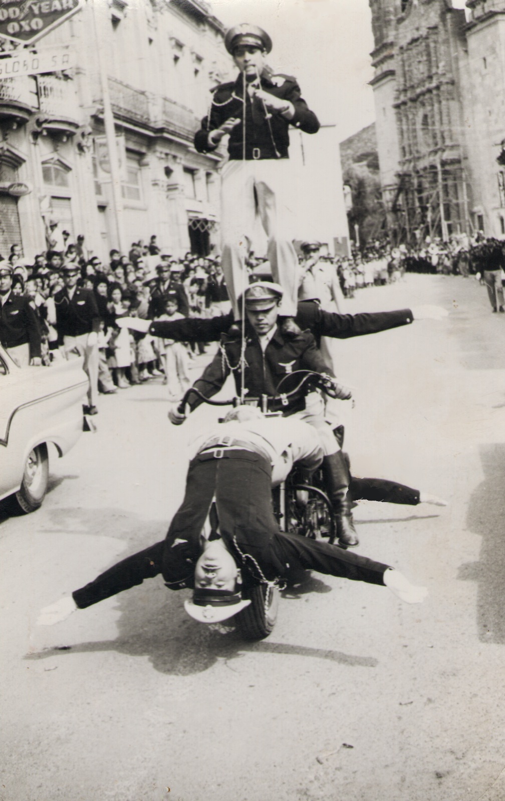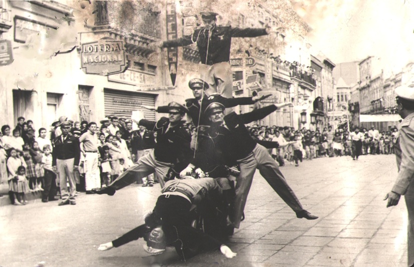 Eran seis oficiales que, sobre la avenida Hidalgo, realizaron la suerte acrobática “La canasta”. En ésta, según se muestra en una vieja fotografía color sepia, que se exhibe en la sede de la Dirección de Transporte, Tránsito y Vialidad, cuatro agentes se colocaron encima de la motocicleta, cada uno en posición de un punto cardinal; unían sus manos a través de brazos estirados; en medio iba el piloto de la motocicleta y, encima de éste, sobre sus hombros, viajaba un elemento que mantenía los brazos estirados a sus costados.