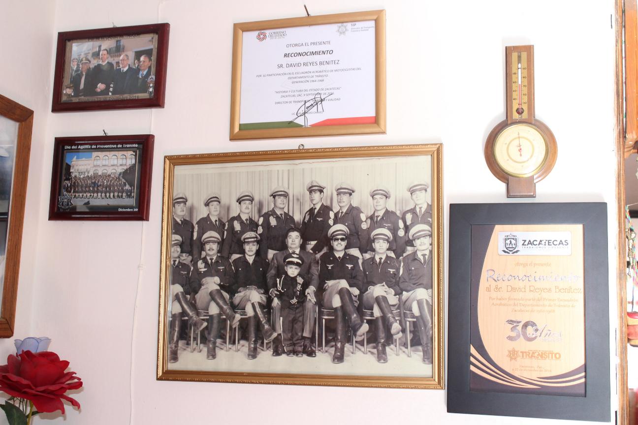 Detrás de éstas y a espaldas de un sillón, en un muro se exhiben fotografías y reconocimientos de quien parece ser un personaje que creó un vínculo especial con la motocicleta y que muy seguramente dejó huella en la Dirección de Tránsito y con el ex gobernador José Rodríguez Elías.