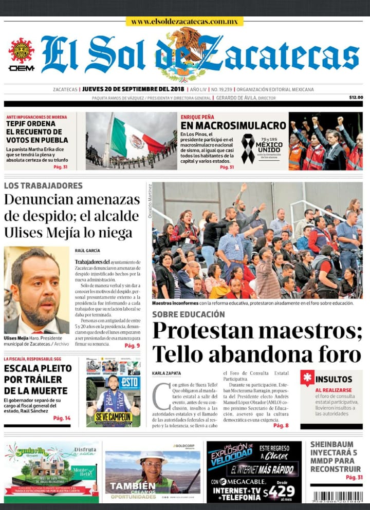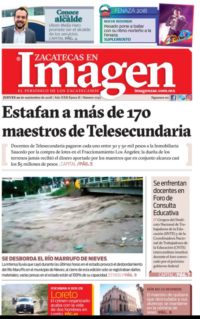 Locales Portadas de diarios impresos Zacatecas jueves 20 septiembre 2018 Admin 20 septiembre, 2018 110 Views Síguenos en Facebook: Trópico de Cáncer Noticias Puedes compartir esta noticia en tus redes sociales.