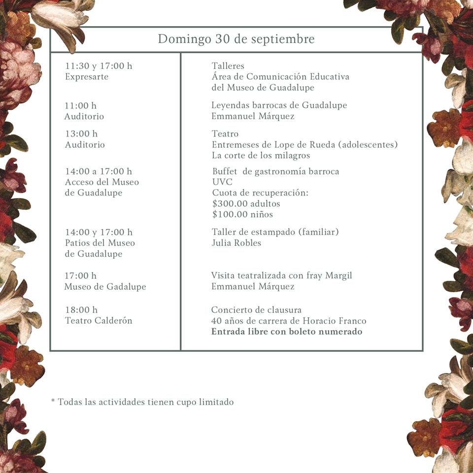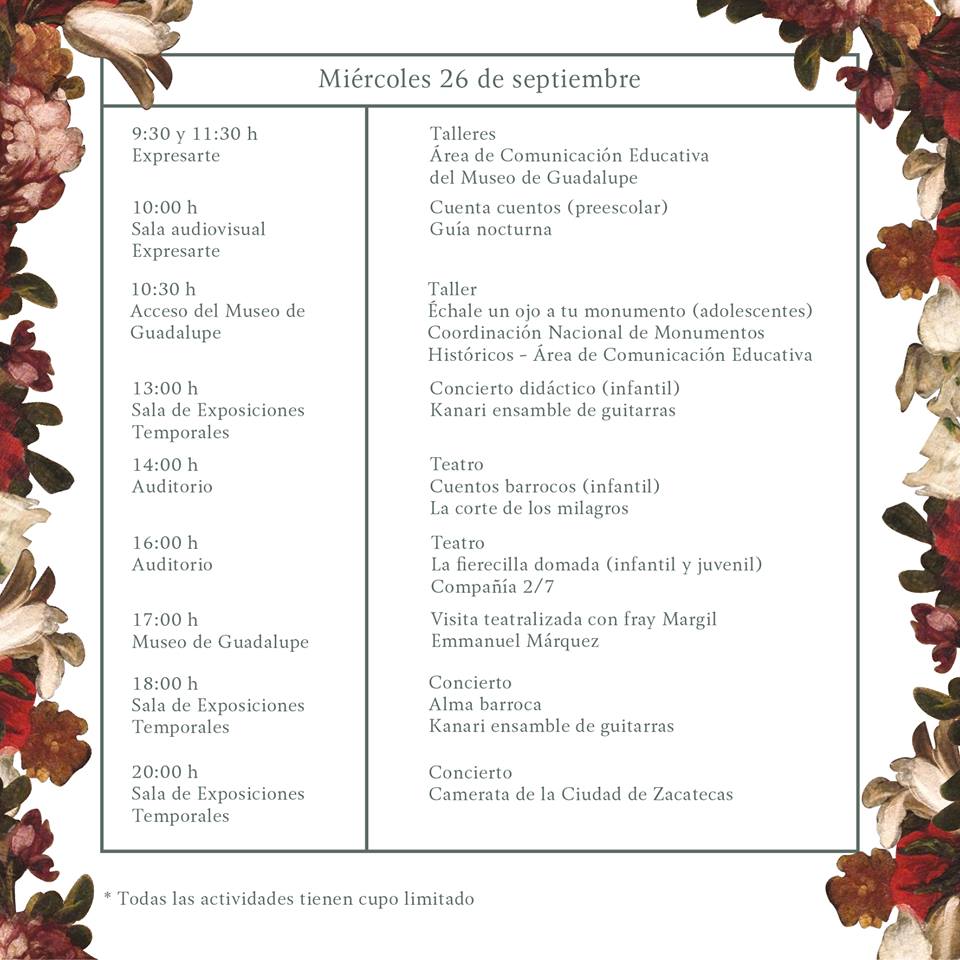 CIUDAD DE MÉXICO. Con más de 70 actividades, todas gratuitas, que incluyen obras teatrales, cuentacuentos, conciertos, visitas teatralizadas, talleres, gastronomía y un ciclo de conferencias, del 25 al 30 de septiembre se desarrollará la edición 17 del Festival Barroco Guadalupe 2018, en Guadalupe, Zacatecas.