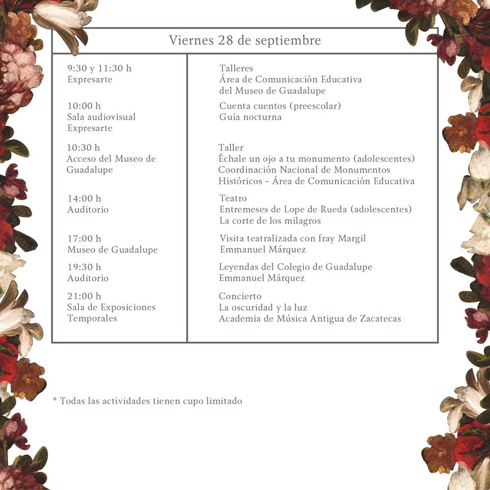 En la edición 17 del encuentro se dictarán las conferencias El barroco en Zacatecas, por Lidia Medina Lozano, de la Universidad Autónoma de Zacatecas (UAZ), y Los frailes de Guadalupe y la reconfiguración de la provincia de Santiago de Jalisco, que impartirán los frailes Carlos Badillo y Raúl Robledo.