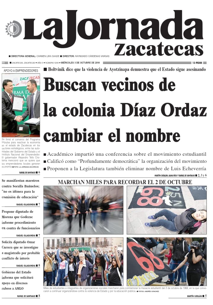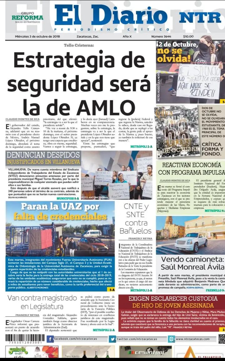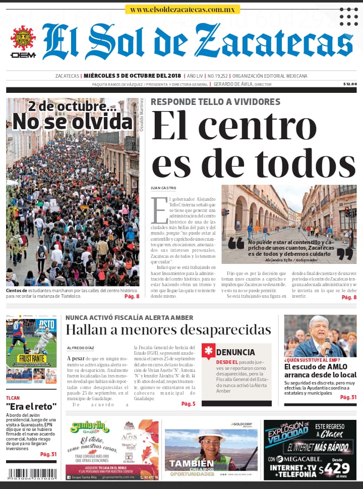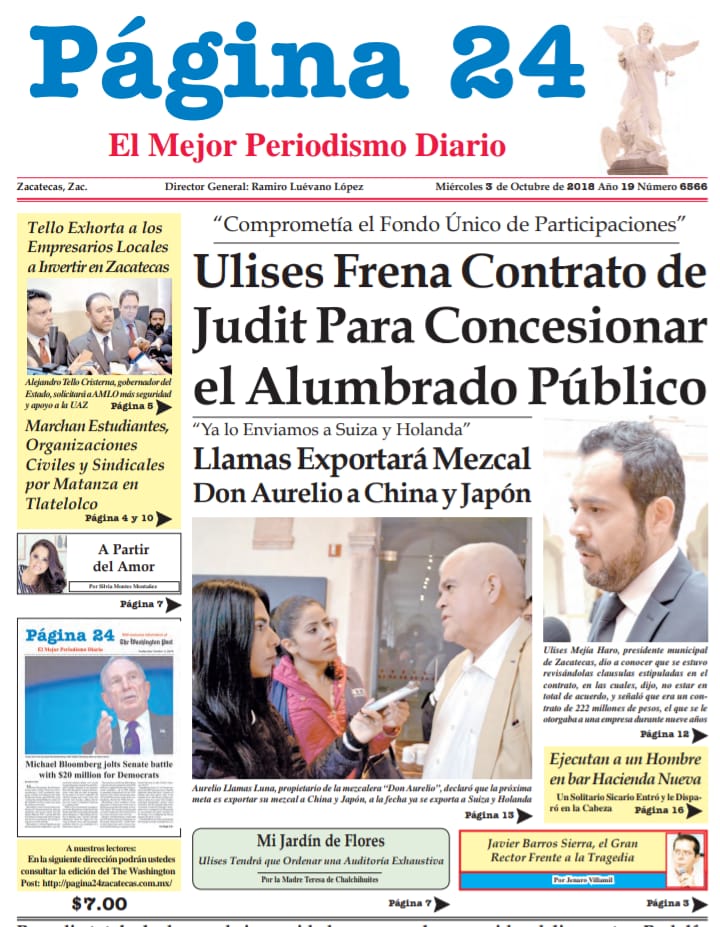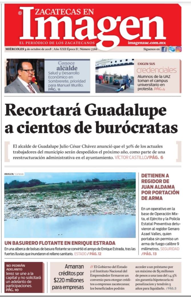 Locales Portadas de diarios impresos Zacatecas 3 octubre 2018 Admin 3 octubre, 2018 610 Views Síguenos en Facebook: Trópico de Cáncer Noticias Puedes compartir esta noticia en tus redes sociales.