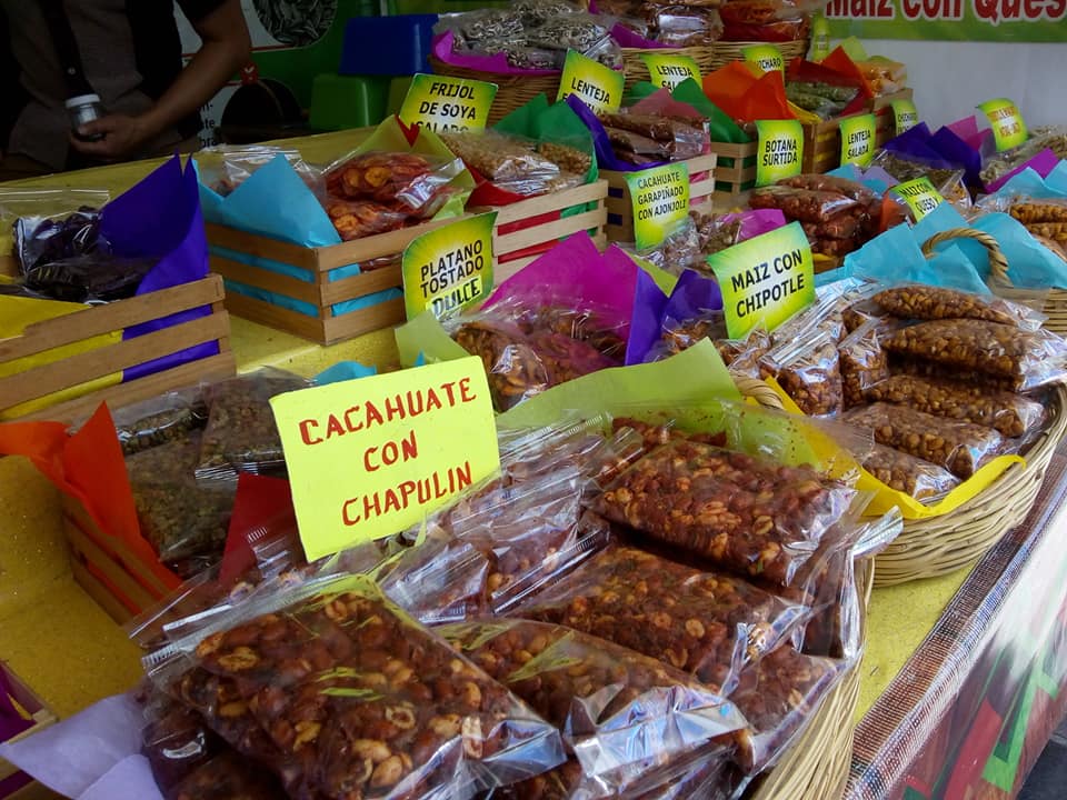 Durante dos semanas, en la Plaza Bicentenario de la capital se podrá degustar los famosos chapulines, frijol de soya enchilado, semillas de girasol, plátano tostado, lenteja, maíz con chipotle, chícharos, frijol de soya, cacahuates con chapulines, arándanos enchilados y más frutas secas.