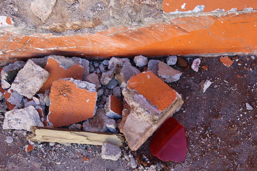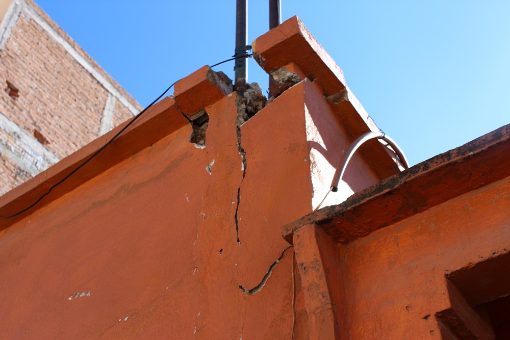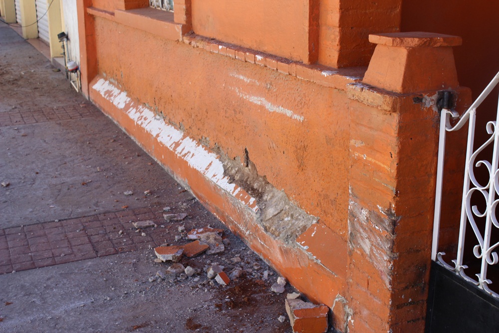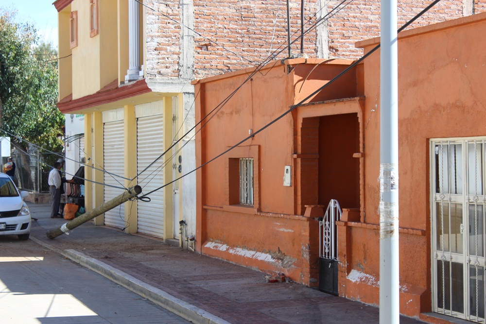 Cuando cayó el poste, los cables se estiraron y rompieron la red eléctrica del domicilio 1 de la vía principal de Tacoaleche, además de dañar la fachada de esta casa; por si fuera poco, el peso de los cables provocó que el siguiente poste se inclinara y, peligrosamente, quedara a punto de caer.