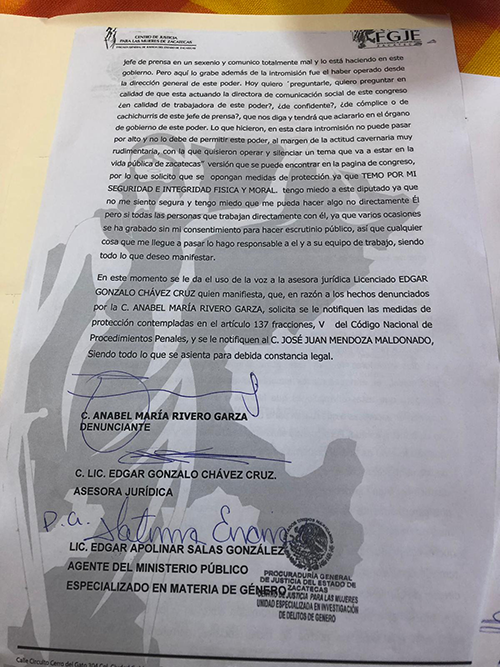 ZACATECAS. Luego de las acusaciones del diputado perredista José Juan Mendoza Maldonado, originario de Río Grande, Zacatecas, en contra de la directora de Comunicación Social de la LXIII (63) Legislatura del Estado, Anabel Rivero Garza, ésta denunció al representante popular y, asimismo, renunció a su cargo.
