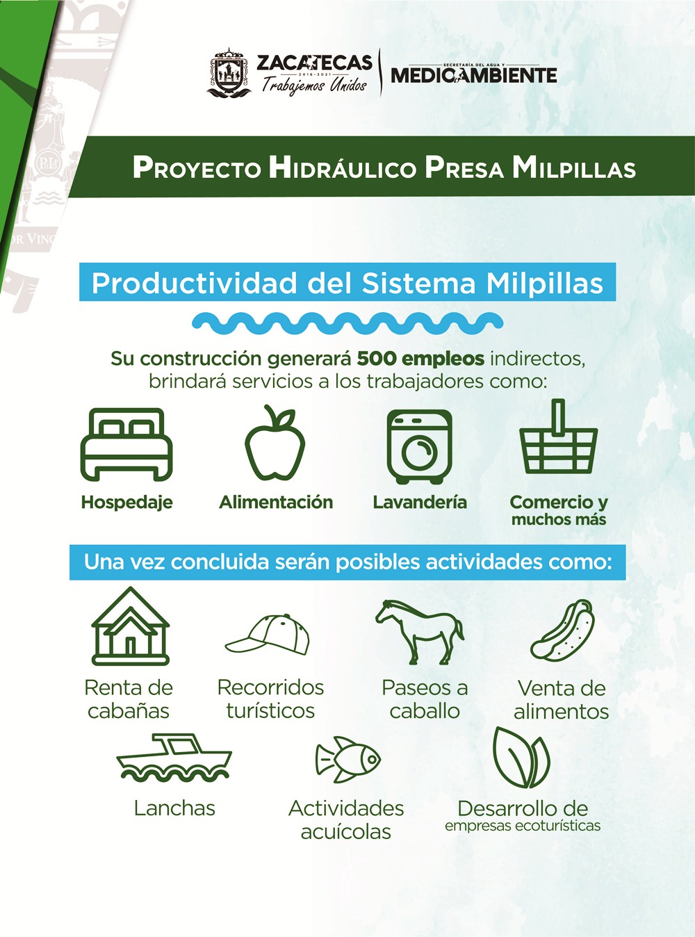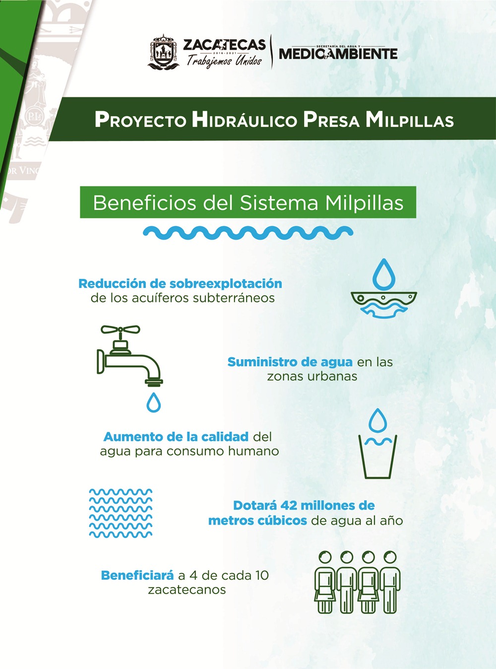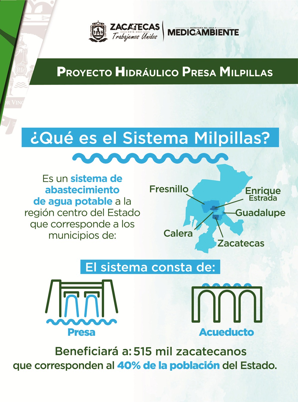 El Proyecto Milpillas, que estaría en el municipio Jiménez del Teúl, abastecería de agua a más de 515 mil zacatecanos de Fresnillo, General Enrique Estrada, Calera, Zacatecas y Guadalupe durante los próximos 50 años.