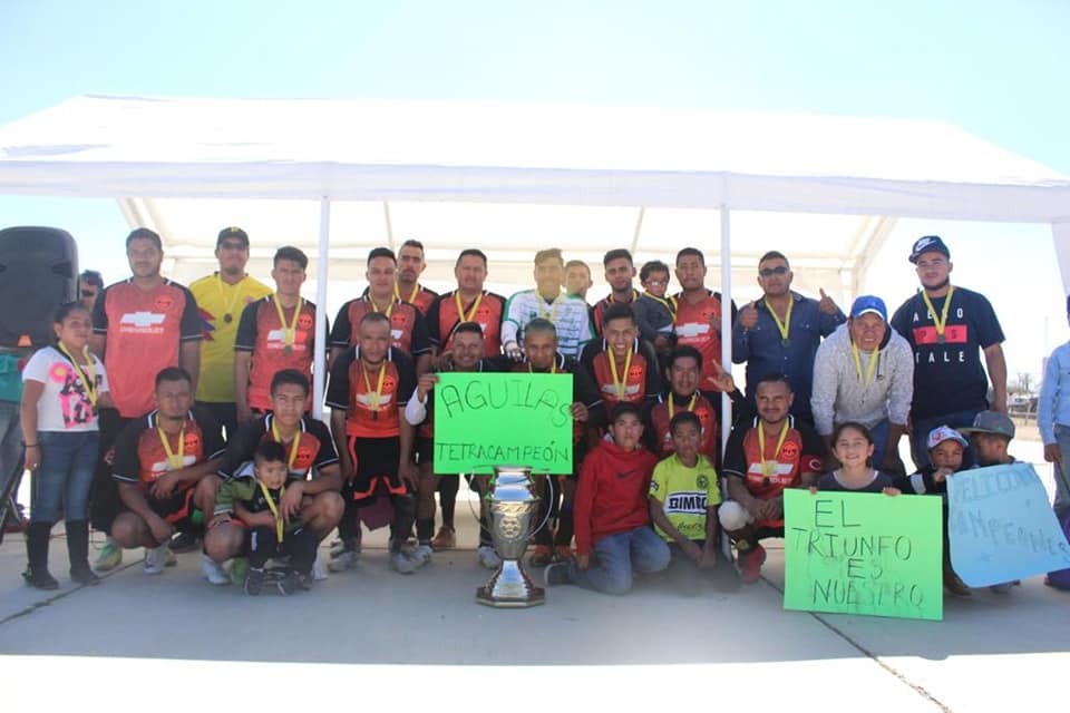 VILLA GONZÁLEZ ORTEGA. Por cuarta vez consecutiva, Águilas Reales se coronó campeón en la Liga de Futbol Hacienda El Carro, en Villa González Ortega, Zacatecas.