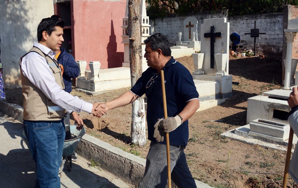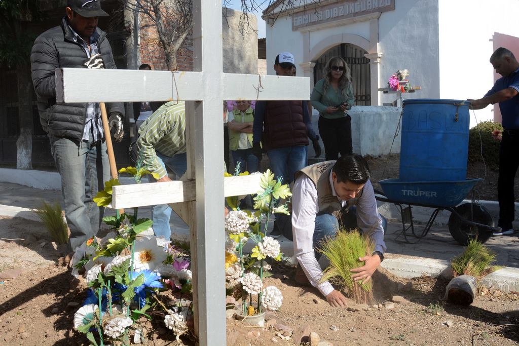 Guadalupe, Zac.- Gracias a la iniciativa impulsada por instrucción del alcalde de Guadalupe, Julio César Chávez, a fin de ofrecer servicios de calidad en espacios dignos para los guadalupenses, La mañana de este martes, el primer edil encabezó los trabajos de rehabilitación, mantenimiento y reforestación del Panteón de Dolores, donde se plantarán más de 240 metros de pasto y más de 60 metros de árboles, además de diversas acciones de limpieza.