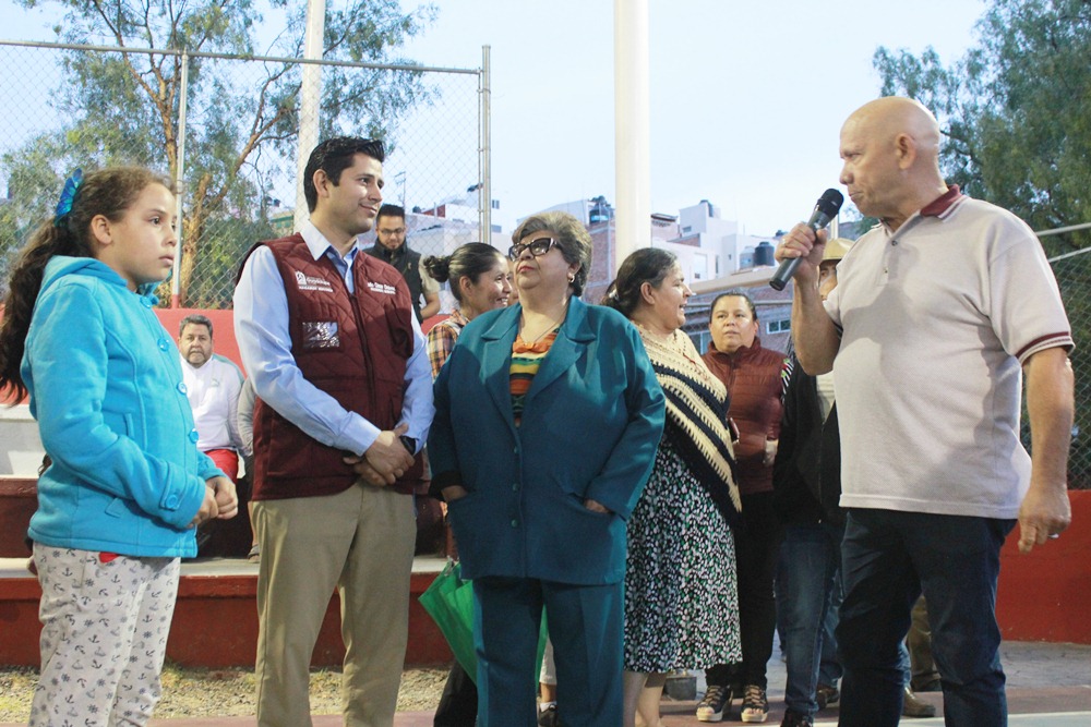 GUADALUPE. Al inaugurar la rehabilitación de la cancha de usos múltiples de la colonia Campo Bravo, espontáneamente, un vecino del lugar agradeció al alcalde Julio César Chávez Padilla por la realización de esta obra, que beneficiará a los niños, jóvenes y, en general, a los deportistas del municipio.