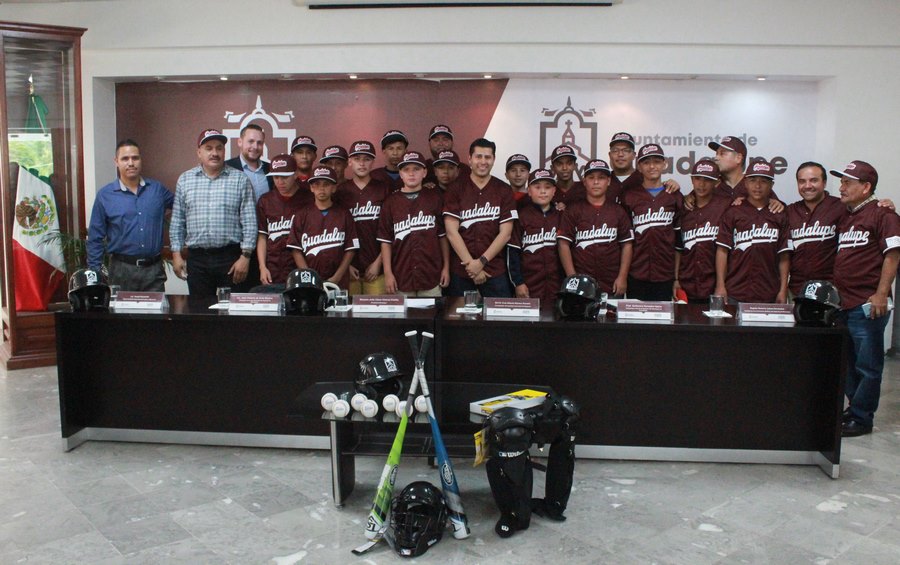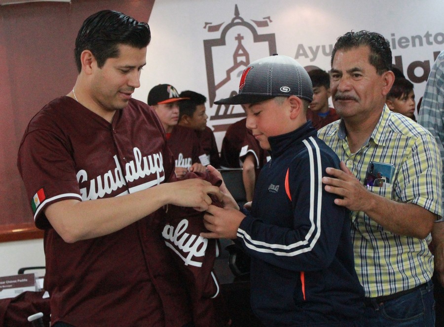 GUADALUPE, ZAC.- El alcalde Julio César Chávez Padilla, entregó uniformes y equipo deportivo a los integrantes del equipo de beisbol de Guadalupe que representará a México en la Serie Mundial de las Ligas Menores de Beisbol sub-15 en Chicago, Illinois del 19 al 30 de julio; en su mensaje dijo a los jóvenes que “aprovechen y disfruten al máximo esta oportunidad, ya que no solo representarán a Guadalupe, sino a todo nuestro país, les deseo el mayor de los éxitos”.