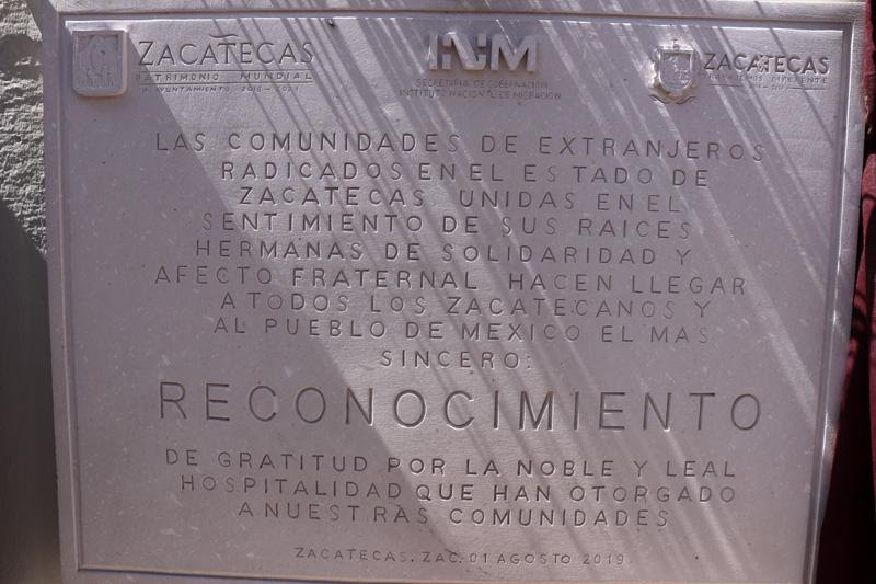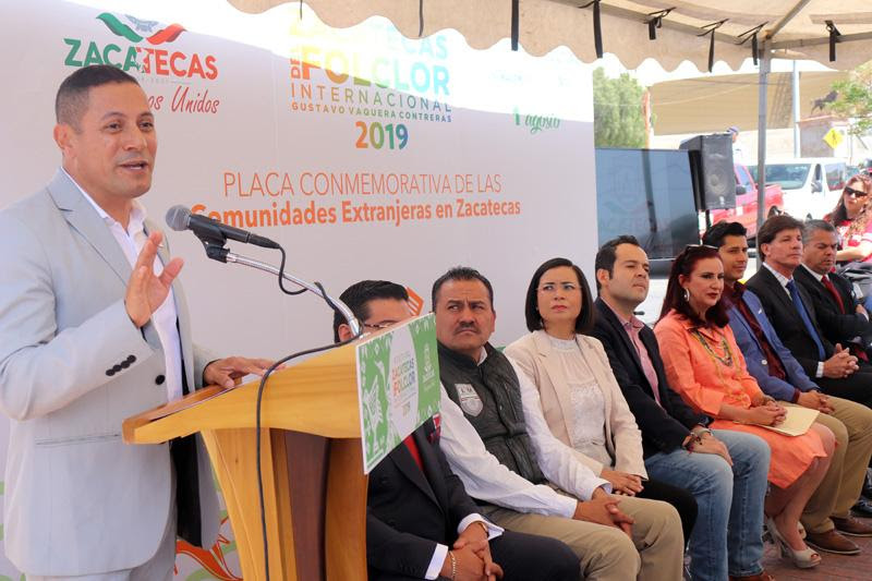 ZACATECAS. En el marco del Festival Zacatecas del Folclor Internacional Gustavo Vaquera Contreras, autoridades de la Secretaría del Zacatecano Migrante (Sezami), de la Comisión de Derechos Humanos del Estado de Zacatecas (CDHEZ) y los Ayuntamientos de Zacatecas y Guadalupe develaron en el Monumento al Migrante una placa conmemorativa para reconocer a las comunidades extranjeras por su contribución económica, cultural y deportiva para Zacatecas.