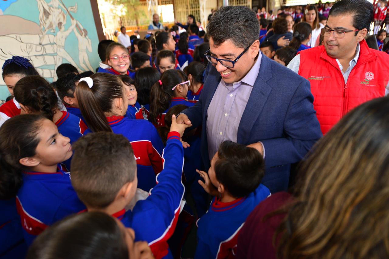 El alcalde Saúl Monreal Ávila y Roberto Luévano Ruiz, titular de la Sedesol, encabezaron la entrega de estos apoyos, con los que se benefició a los estudiantes de las primarias Guillermo C. Aguilera, Anexa a la Normal y 11 de Julio.