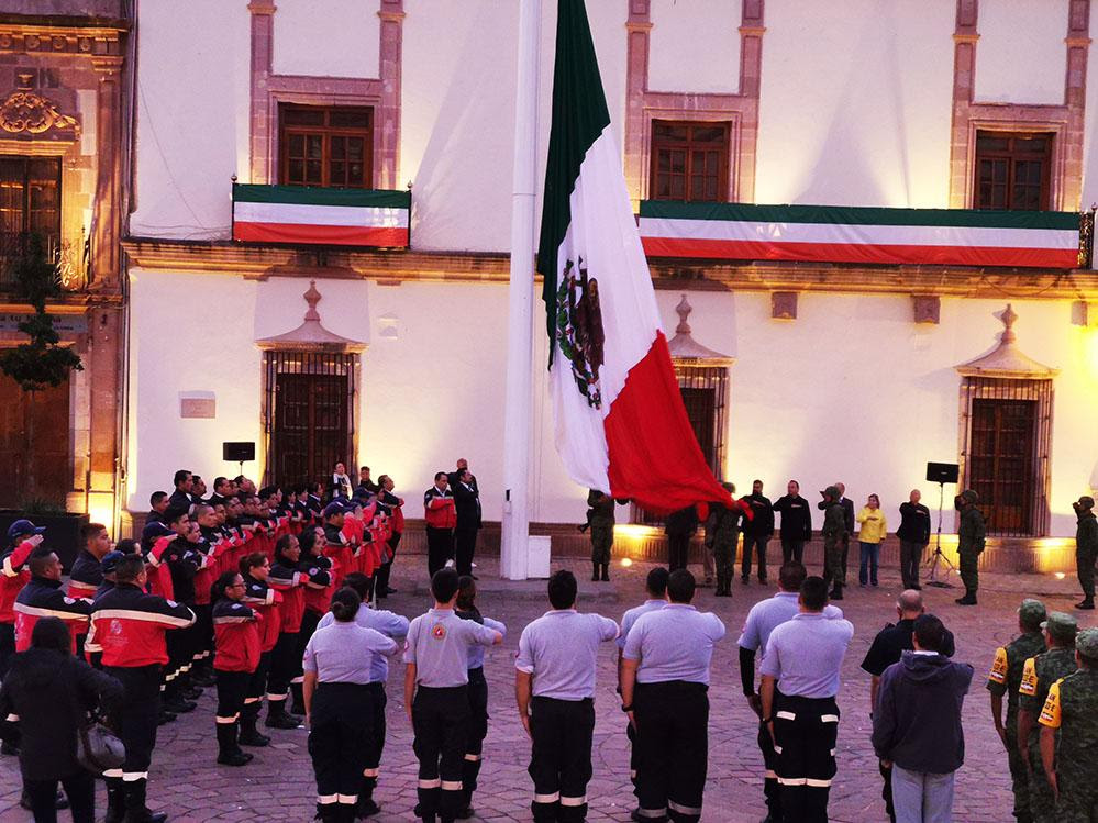Previamente, el Subsecretario de Prevención Social del Delito, Armando García Neri, quien acudió en representación del Secretario General de Gobierno, Jehú Eduí Salas Dávila, encabezó los Honores a la Bandera en la Plaza de Armas e izó el lábaro patrio a media asta, en señal de respeto por los fallecidos aquel 19 de septiembre de 1985, durante el sismo de 8.1 grados que dejó miles de víctimas y daños en la capital del país.