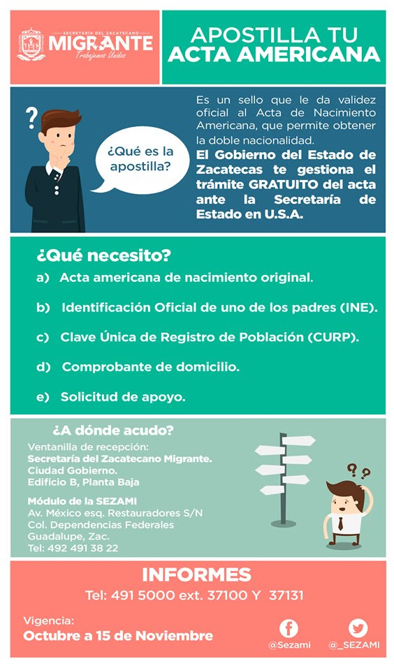 Es decir, el Gobierno de Alejandro Tello gestionará el trámite de la Apostille de Actas Americanas de niños, niñas y adolescentes, hijos de padres zacatecanos migrantes nacidos en Estados Unidos (EEUU).