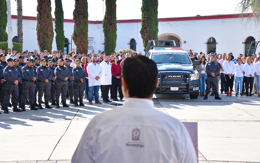 Después de rendir honores a la bandera en el patio de la presidencia municipal, en compañía de autoridades municipales, el presidente municipal destacó que la entrega de patrullas fue posible gracias al esfuerzo que se ha realizado desde el inicio de la actual administración, sobre todo en acciones de seguridad, y a eso “nos comprometimos mutuamente el primer día que rendí protesta”, recordó.
