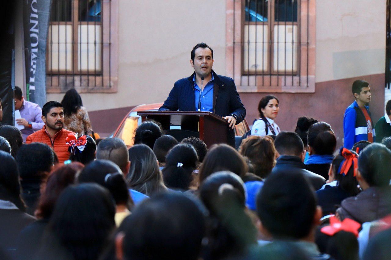 ZACATECAS. Comprometido con la educación y el futuro de niños y jóvenes de la Joya de la Corona, el alcalde capitalino Ulises Mejía Haro entregó un total de 466 becas escolares a 75 de las 83 escuelas públicas de nivel primaria y secundaria con una inversión superior al medio millón de pesos, en convenio con la Secretaría de Educación de Zacatecas (SEDUZAC) y otra parte con recursos propios del municipio, “porque el trabajo honesto y coordinado para la educación por la gran esperanza que son los niños y jóvenes de esta ciudad todo lo vence”.
