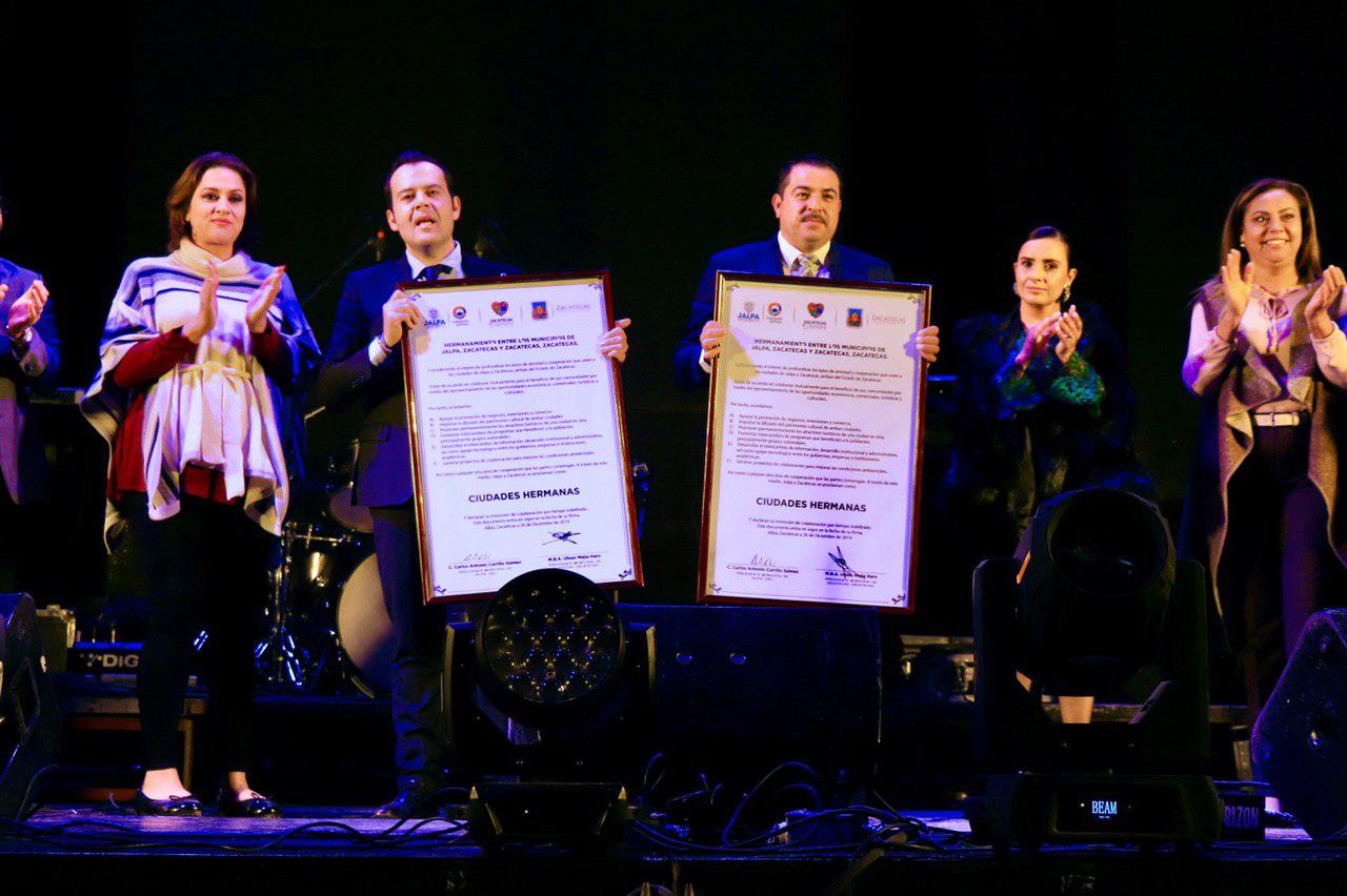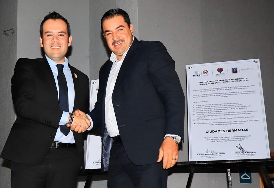 JALPA. En el marco de la Feria Regional de Jalpa, los alcaldes de Zacatecas capital, Ulises Mejía Haro, y Jalpa, Carlos Carrillo Gómez, intercambiaron las Cartas de Hermanamiento entre ambos municipios, en aras de la cooperación y hermandad para el desarrollo turístico, cultural, económico, deportivo y académico.