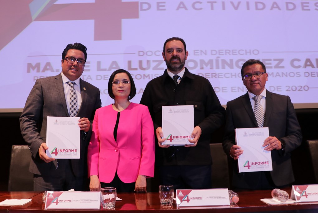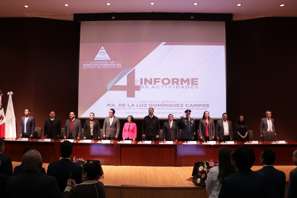 La titular del Organismo Defensor de los Derechos Humanos, rindió su Cuarto Informe de Actividades 2019 ante los titulares de los Poderes Ejecutivo, Legislativo y Judicial, representados por el Lic. Alejandro Tello Cristerna, Gobernador del Estado; el Diputado Omar Carrera Pérez, Presidente de la Comisión Permanente de la la LXIII Legislatura del Estado y el Lic. Armando Ávalos Arellano, así como ante la sociedad zacatecana.