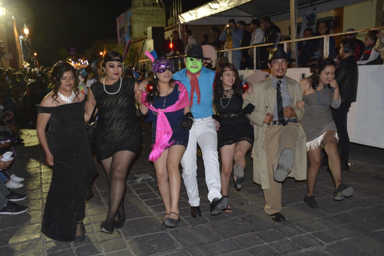 Luz y color fueron los elementos principales de esta fiesta carnavalesca en la que participaron instituciones educativas de nivel medio superior y superior, grupos de baile, comerciantes y como invitados especiales, la Banda Municipal de Guadalupe, la Casa de Cultura de Calera y jóvenes acróbatas de Jalpa.