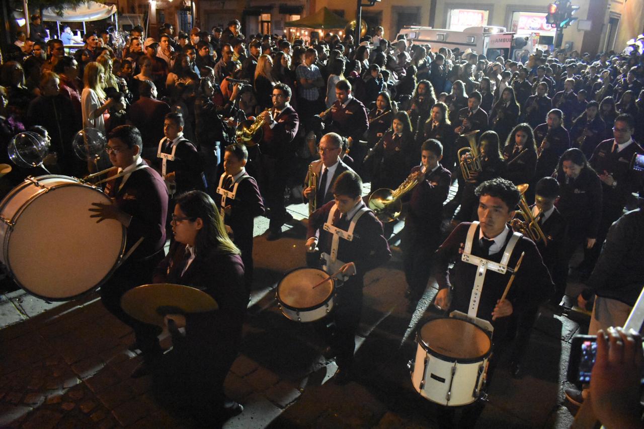 Luces de pirotecnia anunciaron el avance del contingente que partió de la glorieta García Salinas hacia la calle del Hospicio, Jardín Principal y calle San Luis para culminar en el puente del Río Grande.
