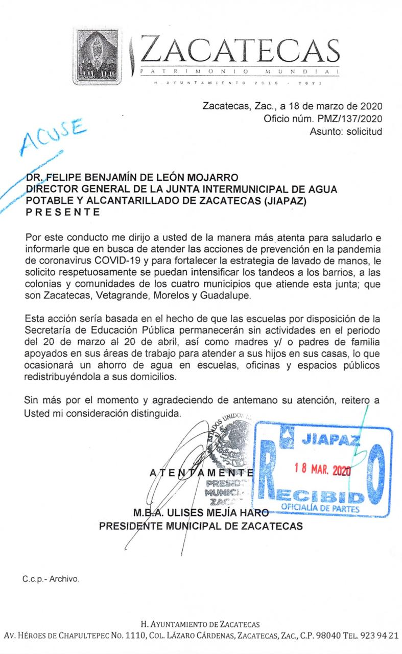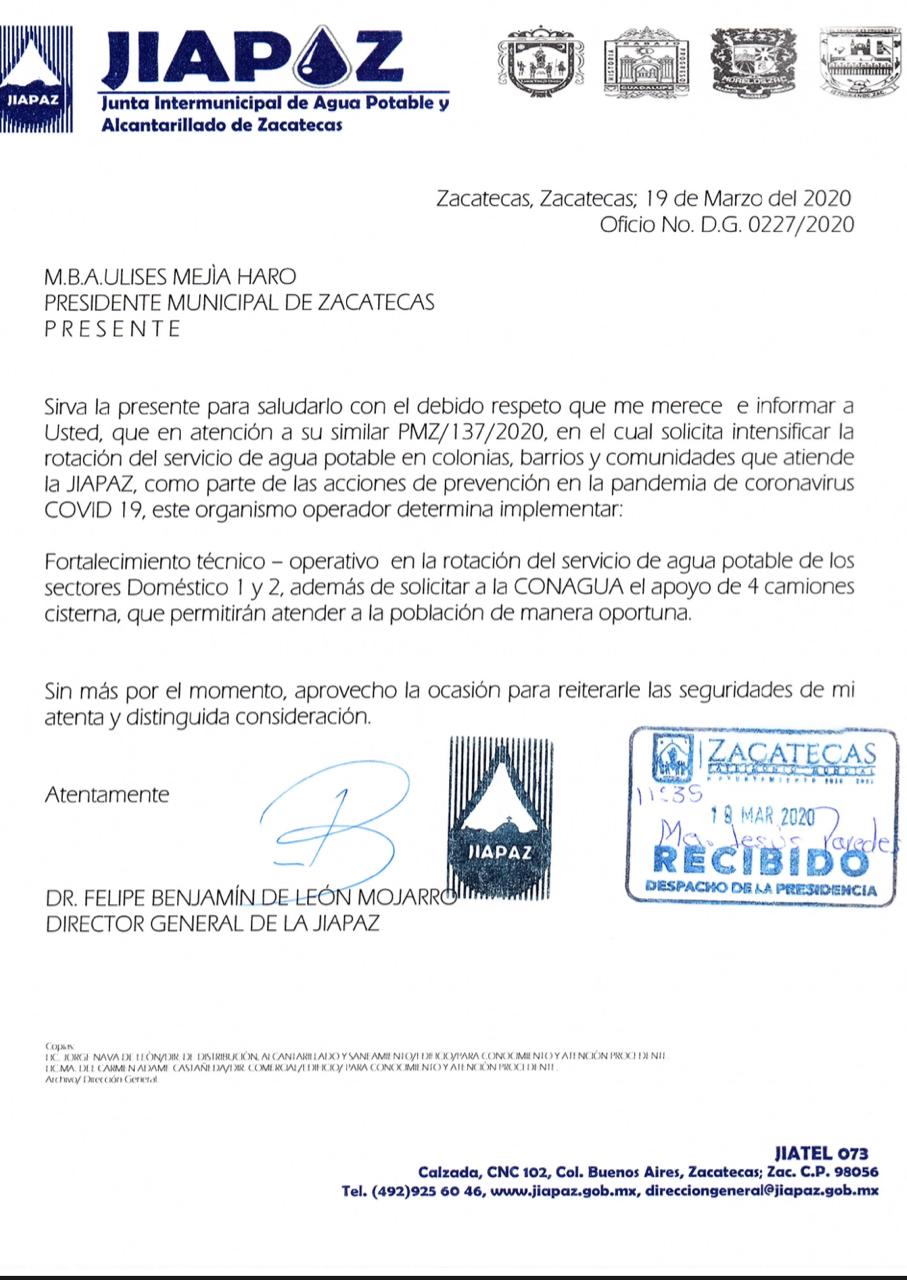 ZACATECAS. A fin de fortalecer la estrategia del lavado de manos como principal medida preventiva frente a la emergencia sanitaria por el coronavirus (Covid-19), el alcalde capitalino, Ulises Mejía Haro, solicitó a la JIAPAZ hacer una redistribución del vital líquido hacia las colonias populares, principalmente los sectores Doméstico I y II en los municipios de Guadalupe, Zacatecas, Morelos y Vetagrande, con una respuesta positiva por parte del organismo operador.