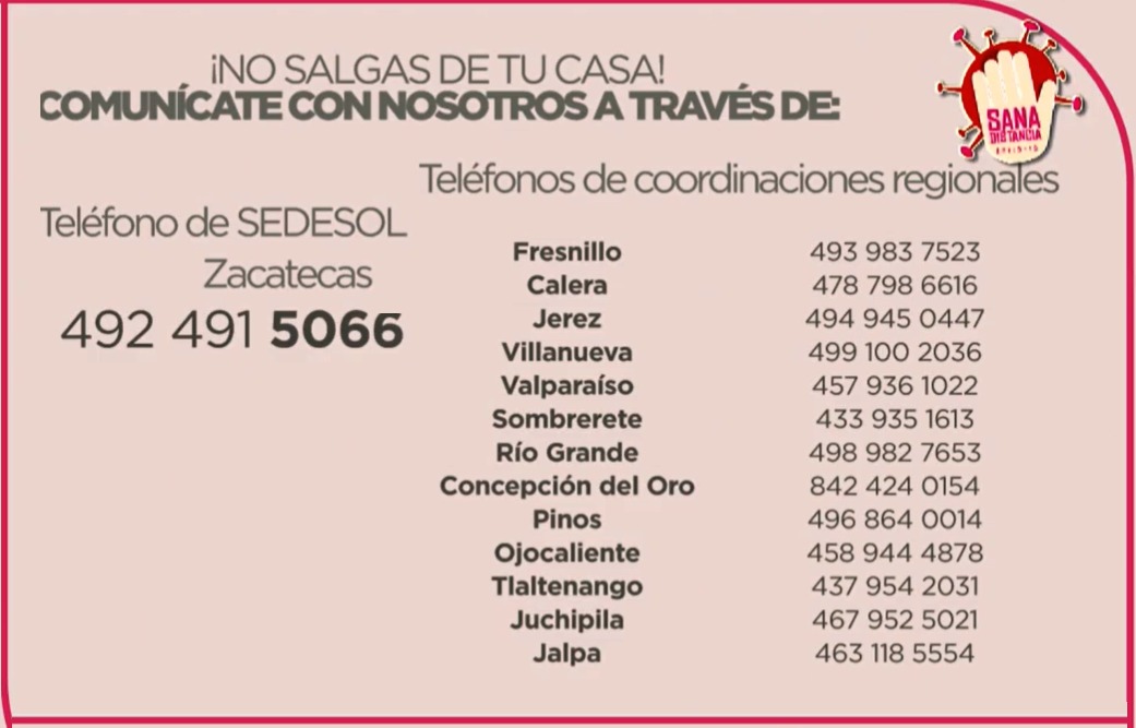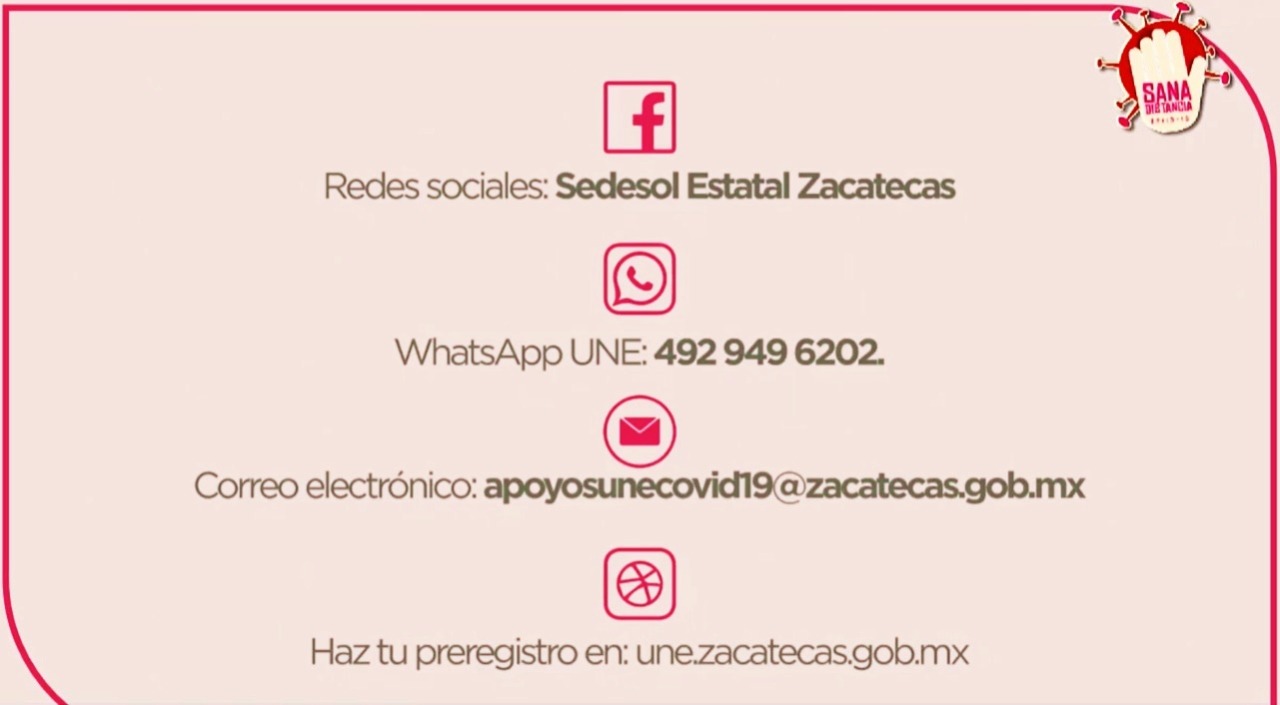 Para evitar el contacto físico y mantener los cuidados de la sana distancia, la Sedesol puso a disposición distintas vías de comunicación para la gestión de apoyos, como con las líneas telefónicas de las coordinaciones en los municipios, así como el Facebook Sedesol Zacatecas, el número 4924915066 de SEDESOL, el WhatsApp 4929496202 y el correo electrónico apoyosunecovid19@zacatecas.gob.mx