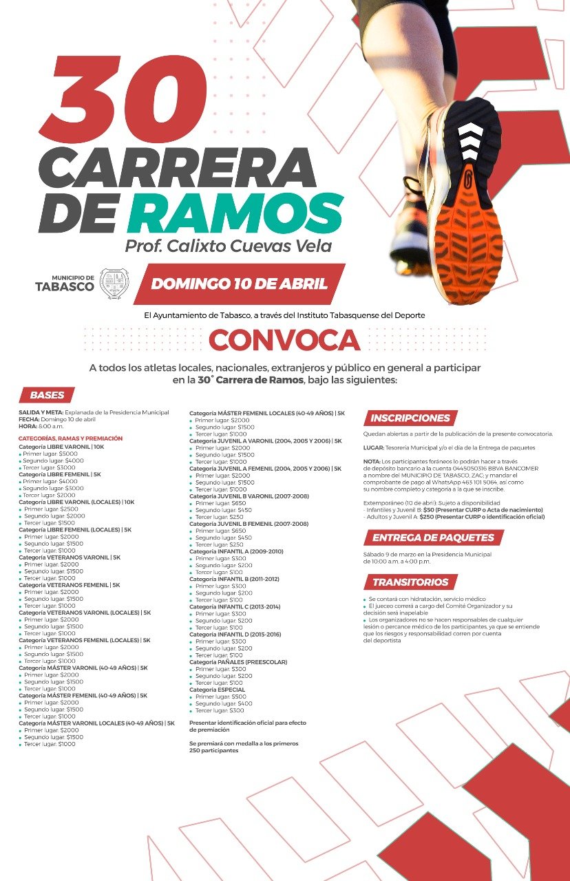 TABASCO, ZAC. Tras dos años de verse suspendida la 30° Edición de la tradicional Carrera de Ramos en Tabasco, Zacatecas, este domingo 10 de abril podrá efectuarse gracias a que se han ido reactivando las actividades en la entidad y en el país; dicho evento está a cargo del Ayuntamiento, a través del Instituto Tabasquense del Deporte.
